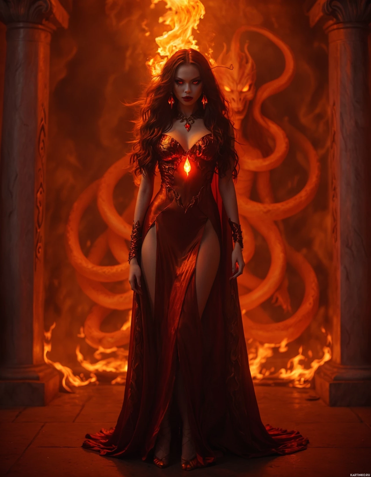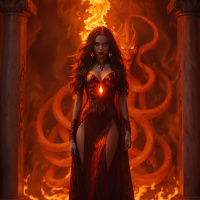 red hair and is wearing an elaborate dress that appears to be a fantasy or supernatural costume, possibly inspired by mythology or fantasy genres. The dress includes intricate details and is predominantly red with accents that suggest a medieval or gothic style. She is standing in front of a doorway that is flanked by two columns resembling those found in