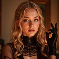 black clothing that has lace-like detailing on it, possibly suggesting a gothic or vampire-inspired style. The background is indistinct but seems to be