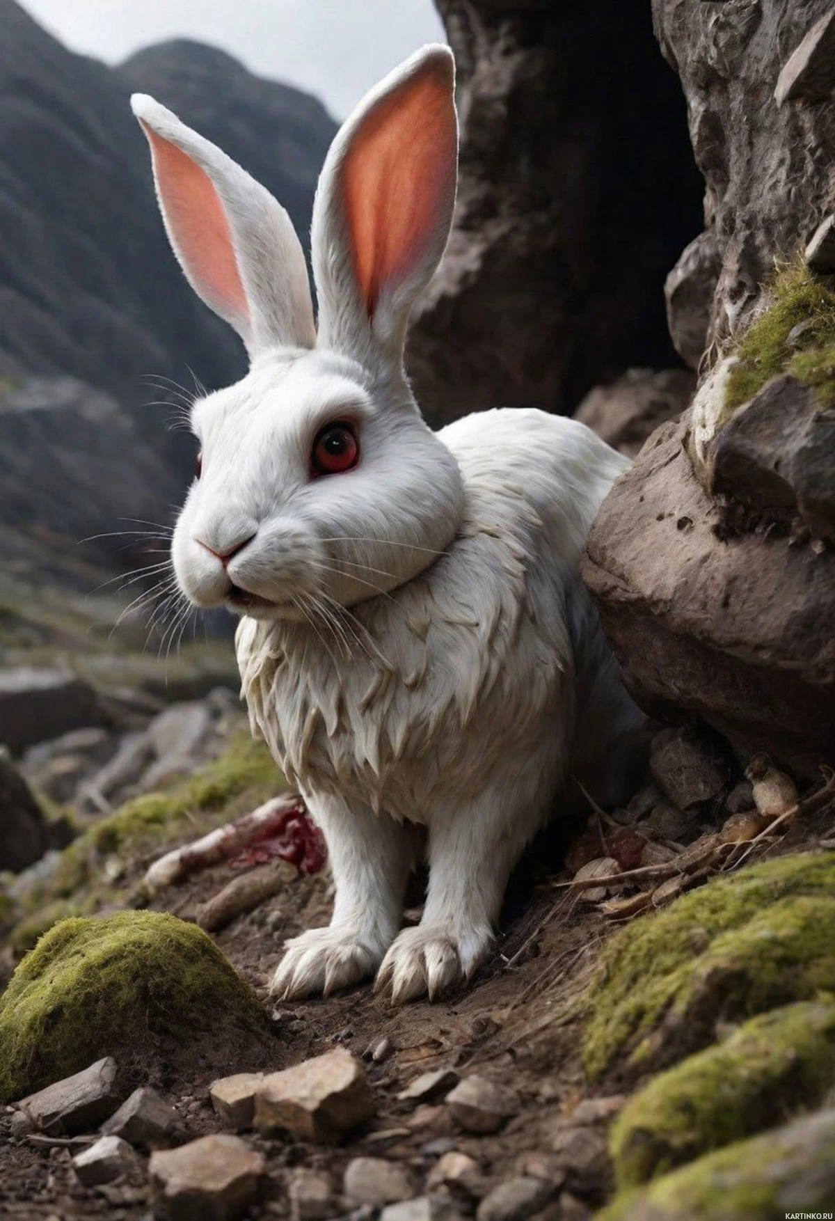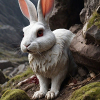 red eyes, situated in a rocky environment that appears to be a fantasy or otherworldly setting. The rabbit is positioned on a patch of