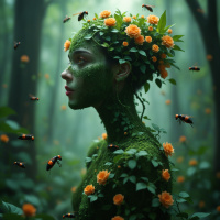 a dense forest with misty atmospheric effects that contribute to a dreamlike quality. It is likely that she has been adorned with these natural elements for an artistic or symbolic purpose. The colors are vibrant and the overall effect of the image is quite serene yet otherworldly.