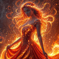 The image depicts a female character with vibrant red hair and an elaborate costume that includes gold accents, reminiscent of a gothic or fantasy style. She stands confidently amidst flames, which are predominantly red and orange in color, suggesting fire as the central element of the composition. The background is dark with swirling patterns of fire and smoke, enhancing the dramatic atmosphere. The character's pose and expression convey a sense of power and presence.
