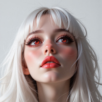 a young woman with white hair, wearing makeup that includes prominent red lips and eyeliner. She has an ethereal appearance due to her pale skin tone and the styling of her hair, which is voluminous and appears somewhat translucent. Her expression is neutral, and she seems to be looking directly at the camera. The style of the image suggests a blend of realistic and artistic elements, possibly indicating that it is