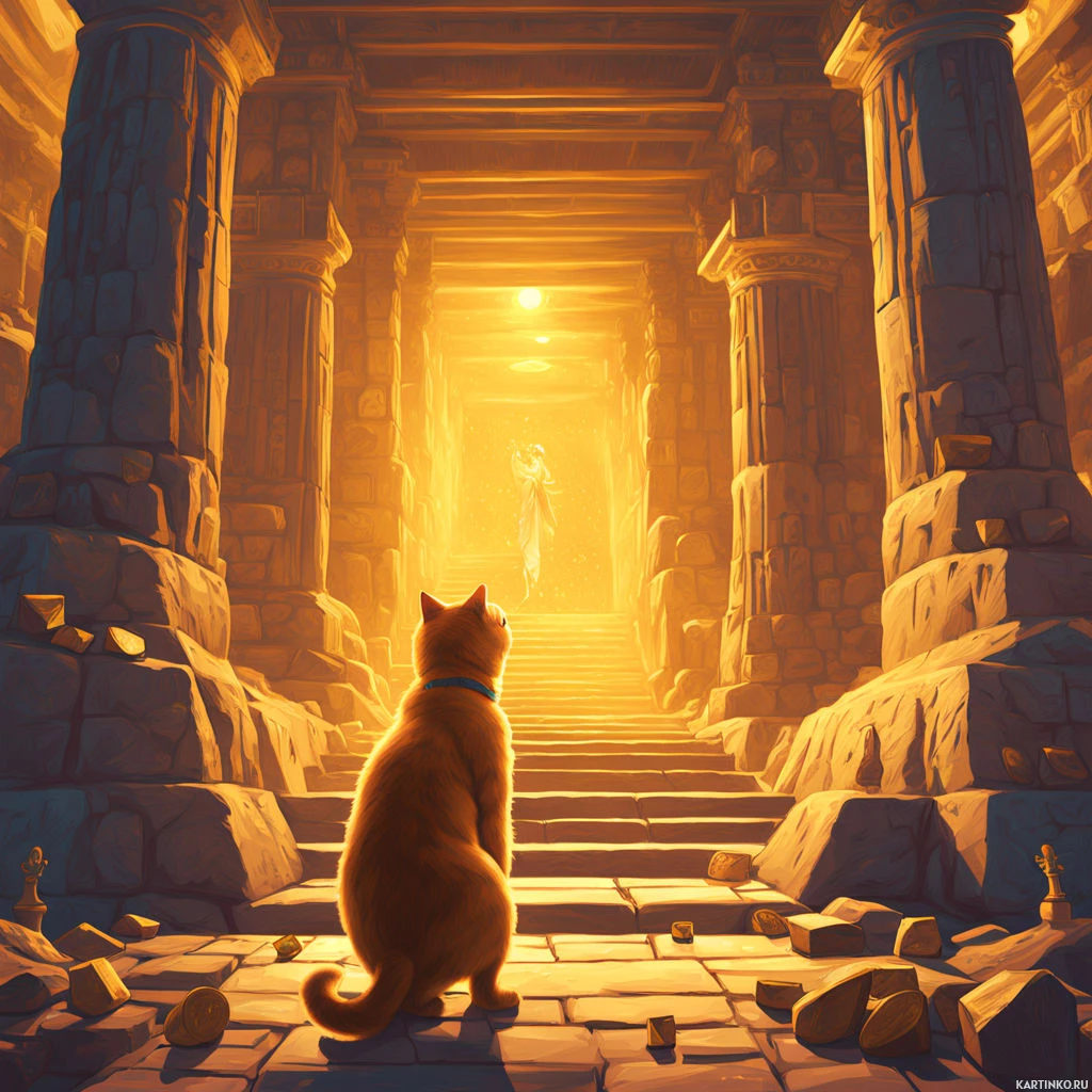 an ancient temple-like structure, featuring large stone pillars and steps leading up to the entrance. A yellow cat is sitting on one of the steps in the foreground, looking forward with
