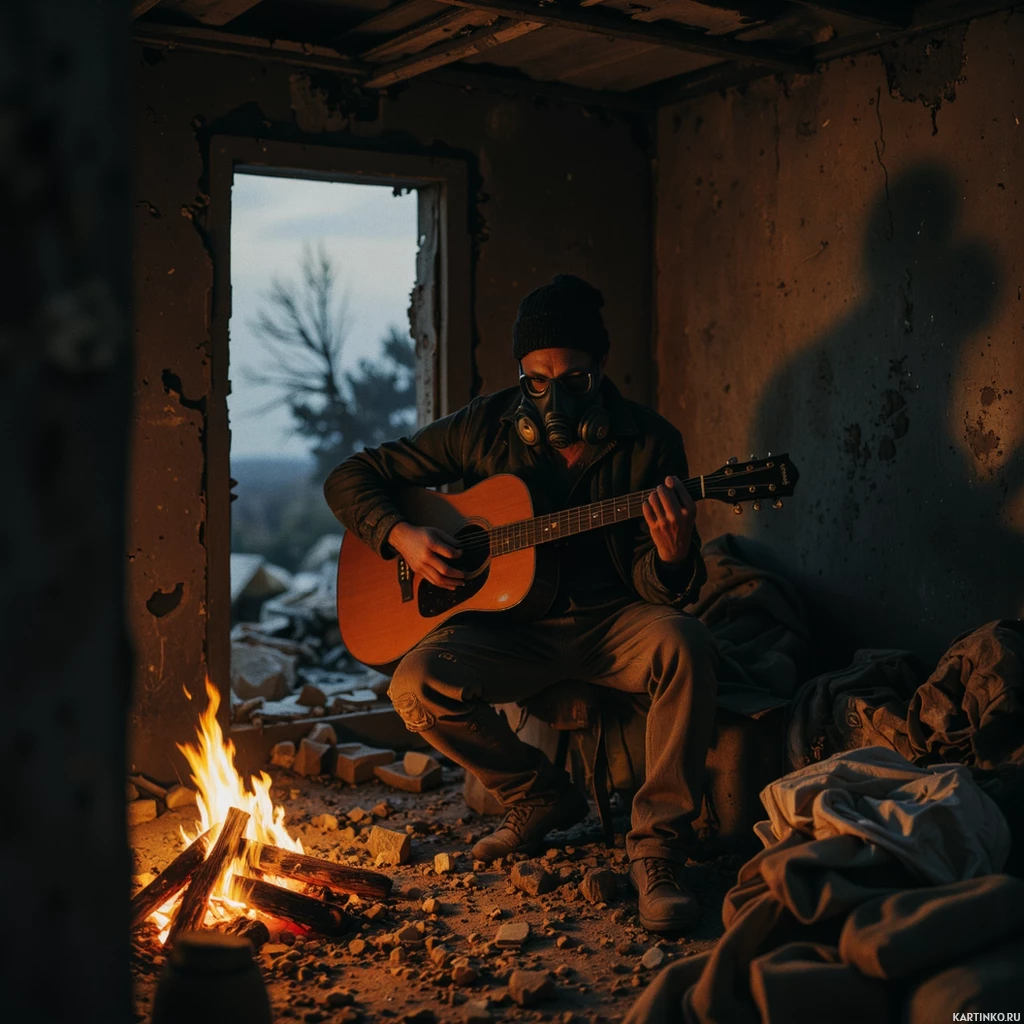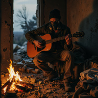 a gas mask and is holding an acoustic guitar in his hands, which he seems to be playing. There are signs of distress around him; the walls are cracked and damaged, there's a fire burning within the structure, and debris scattered throughout the space. He appears to be alone in this environment.