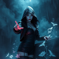 a female figure with a hood over her head, possibly wearing black attire. She is set against a backdrop that suggests a rainy or stormy atmosphere, characterized by
