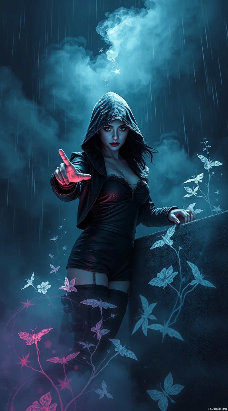 dark clouds and streaks of lightning. Her hand is raised as if reaching out or pointing towards something not visible in the frame. The color palette includes blues, purples, and greens, contributing to a moody and mysterious ambiance. Surrounding her are various elements like leaves and possibly butterflies, which could symbolize transformation or growth. The overall style is evocative of gothic or fantasy themes.
