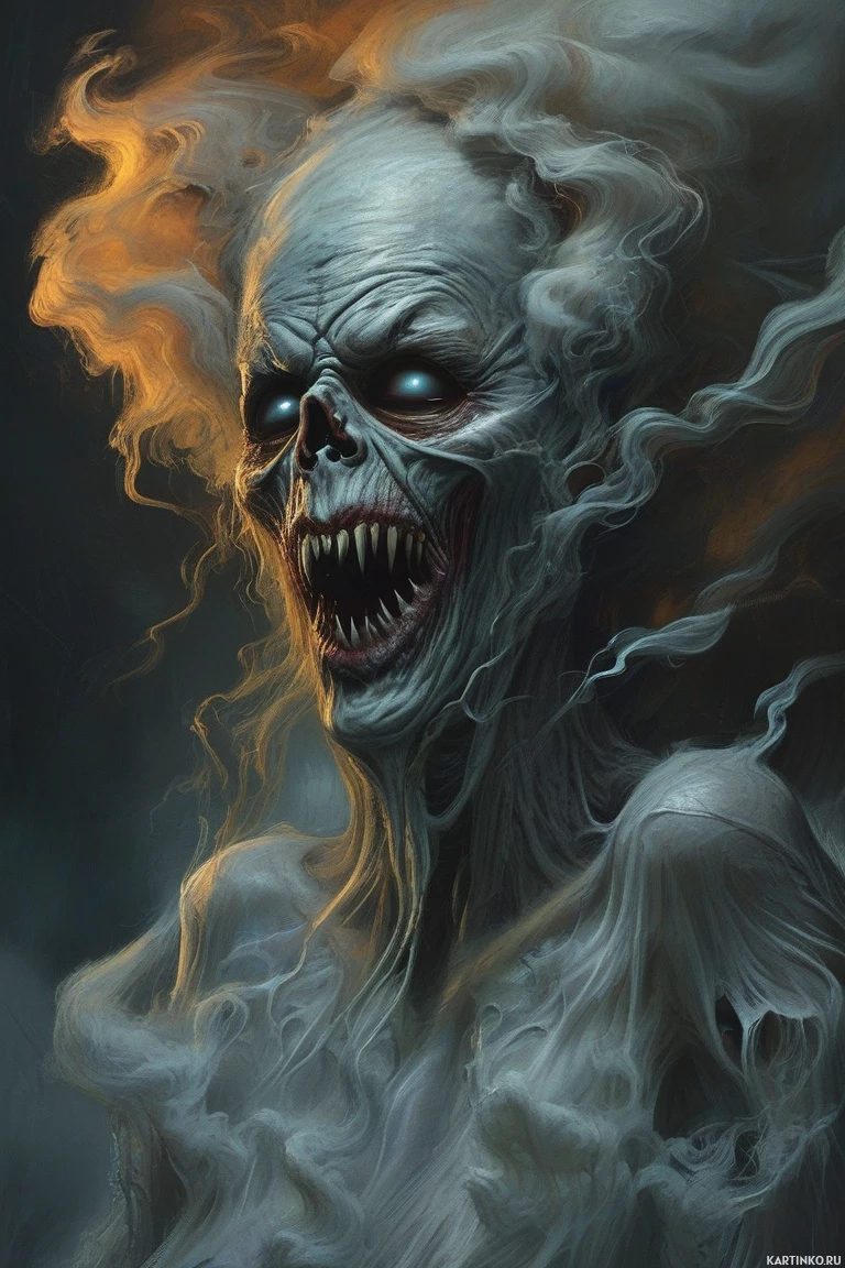a ghostly figure with pale, translucent skin and skeletal features. Its hair appears to be floating upwards, contributing to an ethereal or haunting effect. The creature's eyes are wide open, and its mouth is agape as if it is howling or screaming. There is