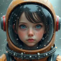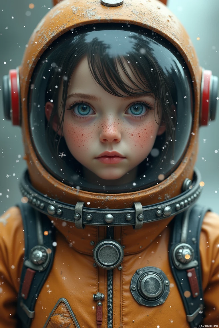 space suit that includes a helmet with a clear visor. The expression on her face suggests
