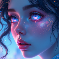 blue eyes that seem to glow with a luminescence. Her skin appears pale, which adds to