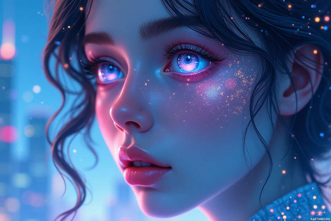 a sense of solitude or introspection. The background features a digital cityscape that is blurred but gives an impression of tall skyscrapers or buildings at night, with illuminated windows adding to the urban ambiance. However, there are also cosmic elements interspersed within this backdrop, like sparkling stars and nebulous clouds that add a dreamlike quality to the scene. The artwork is rich in color gradients and light effects that create an atmosphere of both realism and fantasy. The use of digital tools for artistic expression has resulted in a high level of detail and depth, making the image visually captivating and intriguing.