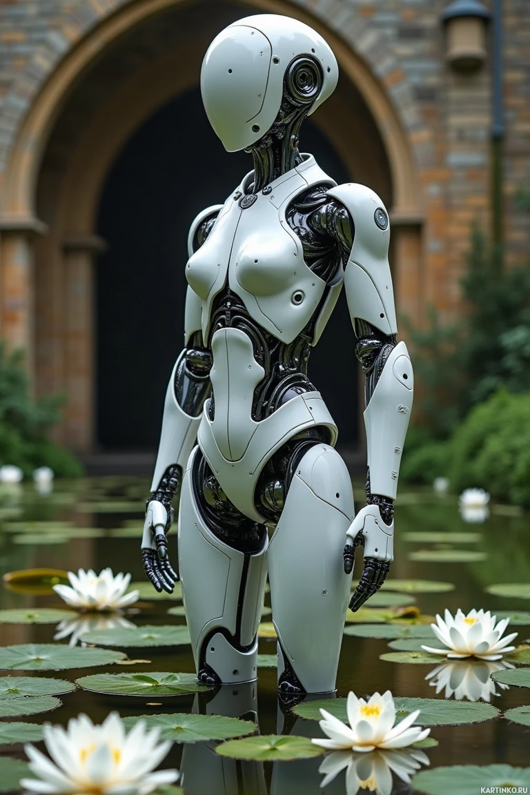 intelligence systems integrated into its face. Its arms are extended outward, and it has articulated fingers that suggest dexterity. The robot is situated in a pond, surrounded by lily pads on
