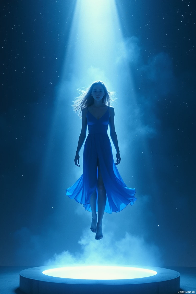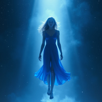 blue dress that flows around her as she levitates. Her arms are gracefully extended upwards towards what seems to be a beam of light emanating from above, illuminating the surroundings and creating