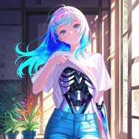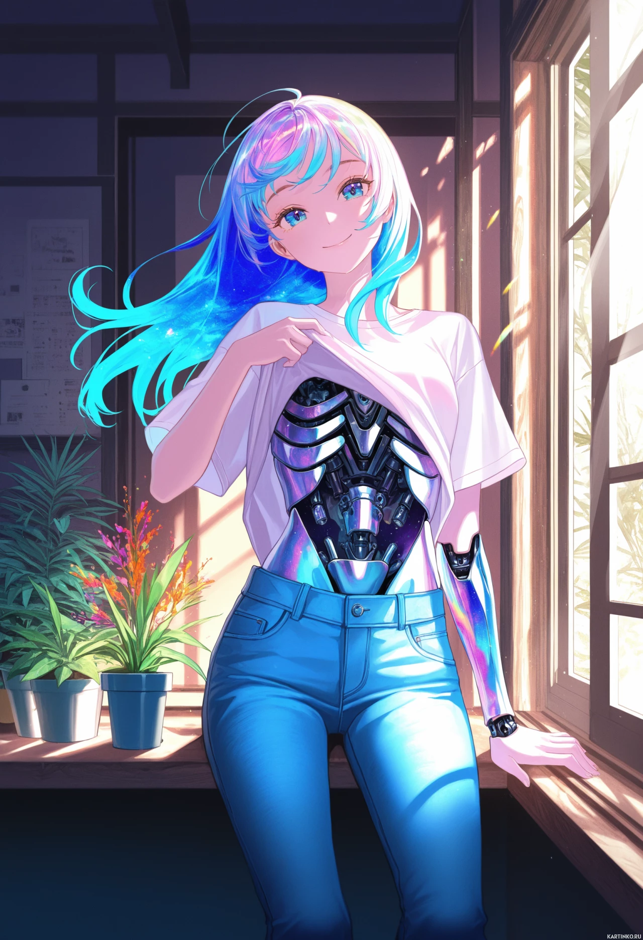 chest area where a robotic arm is attached to her body. The setting seems to be indoors, possibly a room with a window that allows