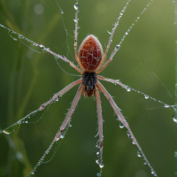 a blurred background that suggests greenery and possibly a source of light illuminating droplets of water around it, indicating either recent rain or dew formation.