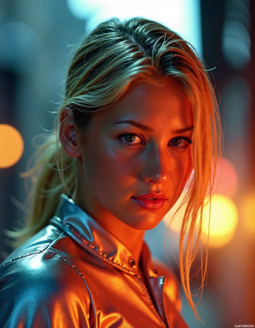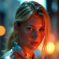 a subtle sparkle in them that suggests an awareness of the camera's presence. She is wearing what appears to be a silver or gold-toned jacket, which could indicate that it is either sunrise or sunset due to