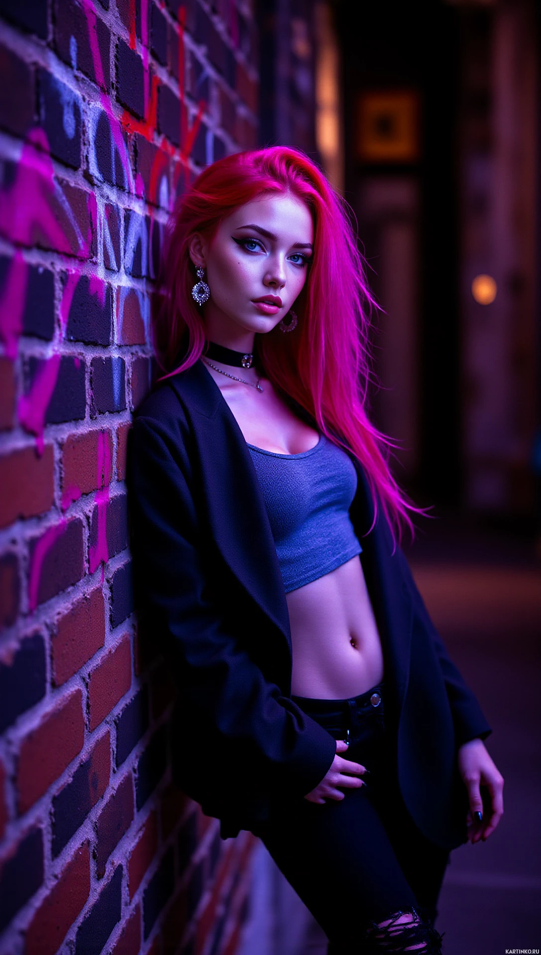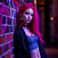 a dark top that appears to be off-shoulder, possibly paired with denim or jean material pants. The person is posed against a backdrop that includes a brick wall with graffiti, suggesting