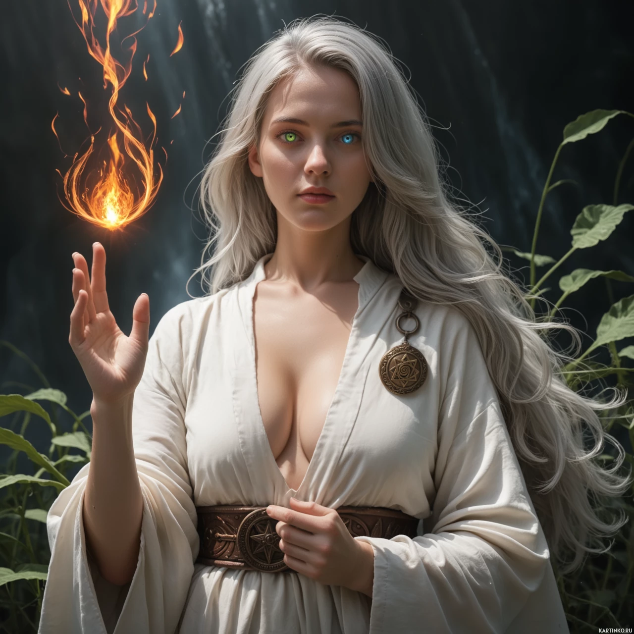 a female figure with white hair, holding out her hand towards a flame. She is dressed in what appears to be historical or