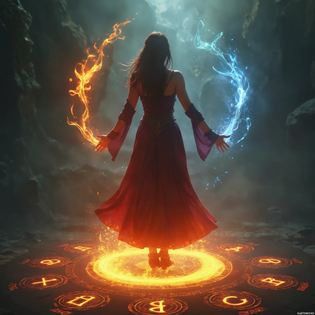 orange flame and the other in blue ice. The ground beneath her feet features