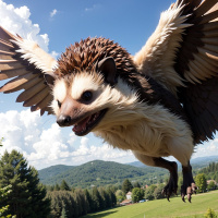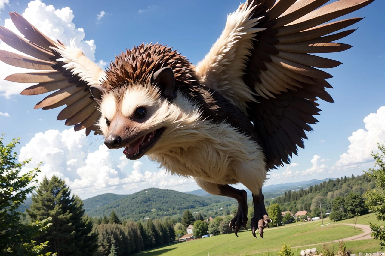 The image features a whimsical and fantastical creature that appears to be a blend of a hedgehog and an eagle. This character has the body, face, and spines of a hedgehog with its characteristic dotted pattern. Instead of typical hedgehog legs, it has large, majestic