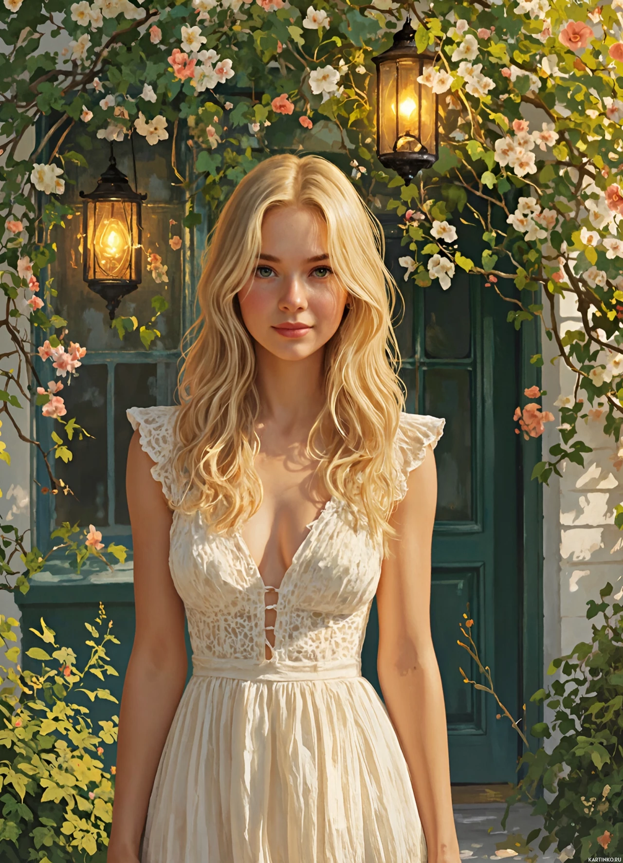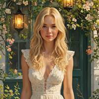 a pendant necklace or a brooch on her chest. The setting is outdoors, with a cobblestone street visible in the background. Hanging lanterns can be seen above the street, contributing to a charming and old-world atmosphere. The woman's position within this scene suggests she may be posing for a portrait or an advertisement due to her poised stance and the attention to detail in her appearance and clothing.