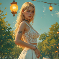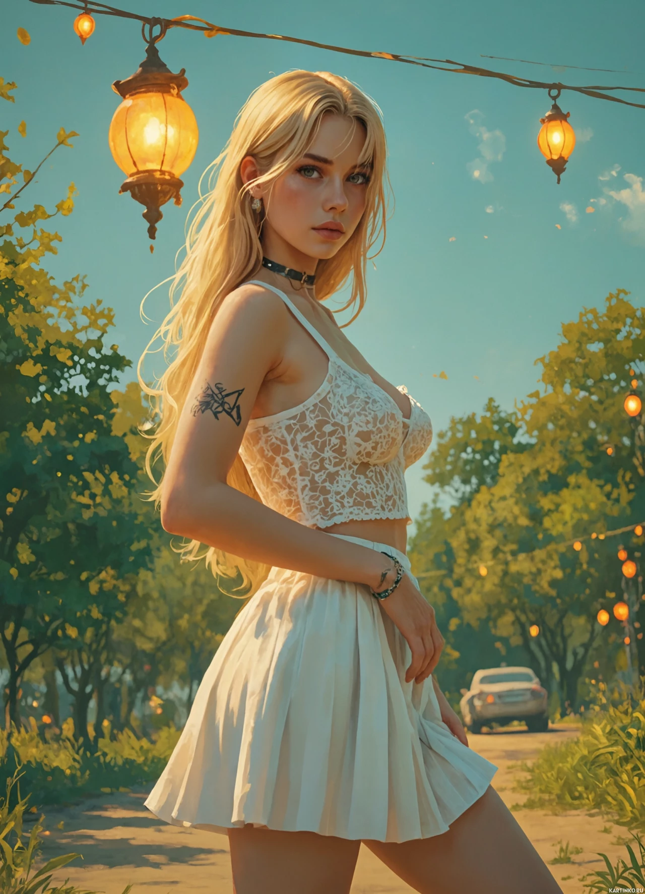 blonde hair and a tattoo on her right arm. She is wearing a white, lacy top and a skirt over her pants. She has a piercing in her left ear and a visible necklace. She is standing next to a road with cars in the distance and there are trees around her. The lighting suggests it might be dusk or evening due to