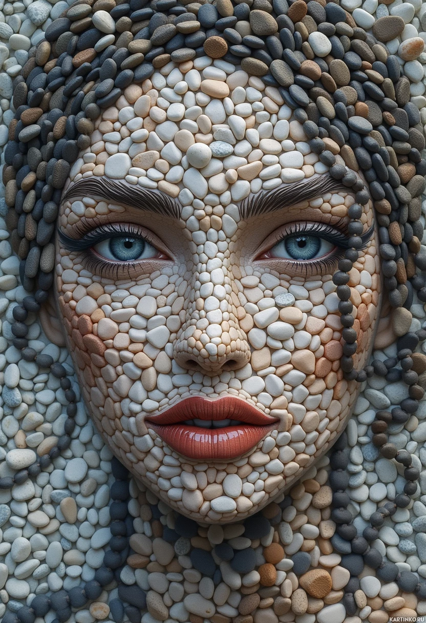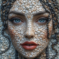 small stones or pebbles. This gives the impression that the woman's face is emerging from a mosaic-like wall. The color palette is dominated by