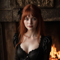 a young woman with red hair, wearing a black, corseted top and fishnet stockings. She has a demure or contemplative expression on her face. In the background, there appears to be a fireplace with flames visible behind her, suggesting