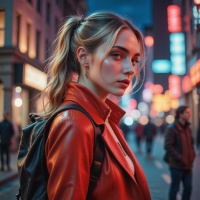 a young woman with blonde hair, standing on a city street at night. She is wearing a red