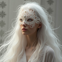 a lace mask on her eyes and has an ethereal, ghostly quality to her appearance. Her attire consists of what seems to be a traditional or vintage-style dress, possibly with