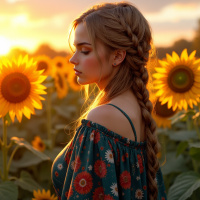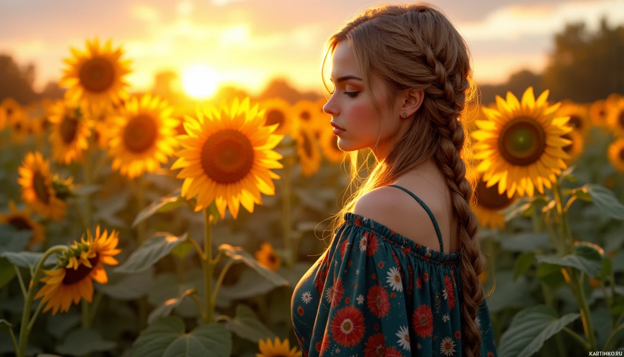 the warm glow of the setting or rising sun, which bathes the scene in a golden light. Her hair is styled in braids, and she wears a patterned top that complements