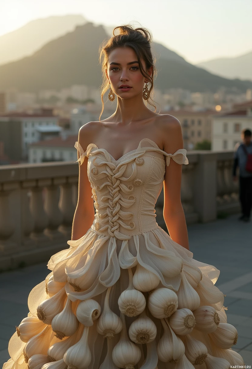 The image features a young woman posing in an elegant gown with a unique design. She is standing on what appears to be a balcony or bridge overlooking a scenic view of mountains and a cityscape below. Her attire is intricate, showcasing an elaborate dress with a textured pattern that includes elements resembling garlic bulbs as decorative motifs. The woman has a styled hairstyle and is gazing towards the camera with a neutral expression on her face.