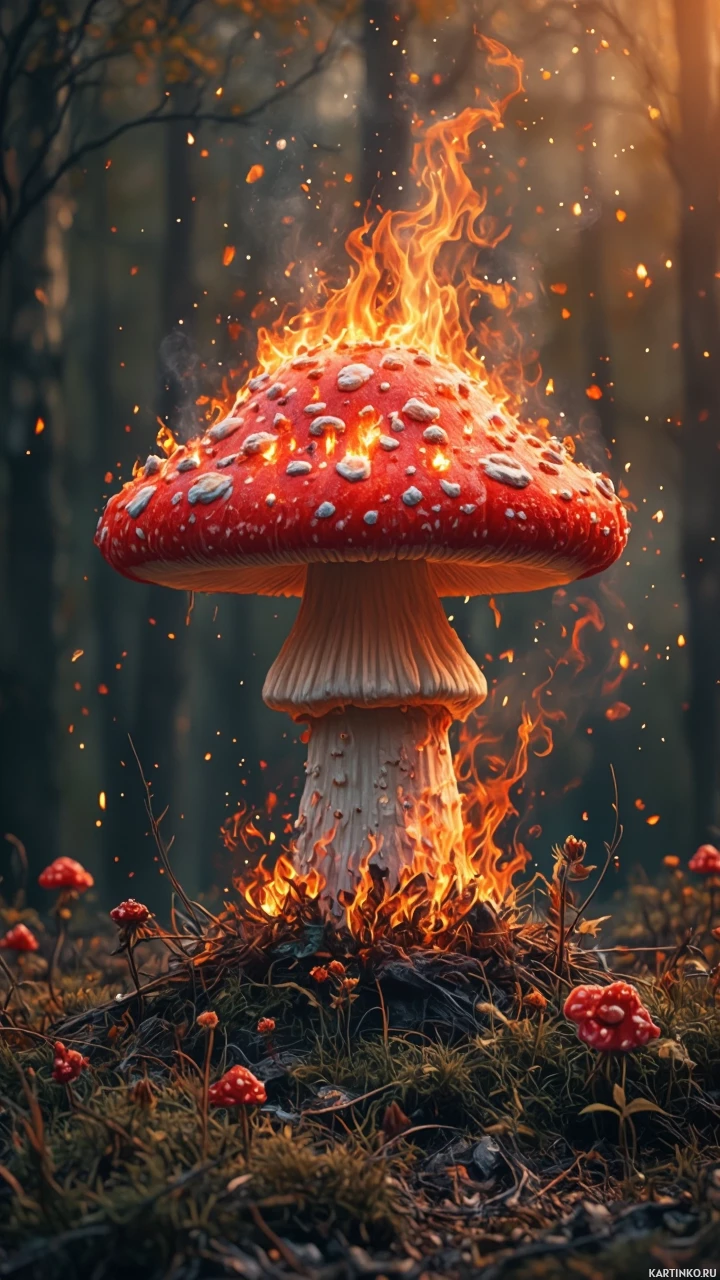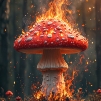 The image depicts a mushroom with flames emanating from it. It's set against a background that suggests