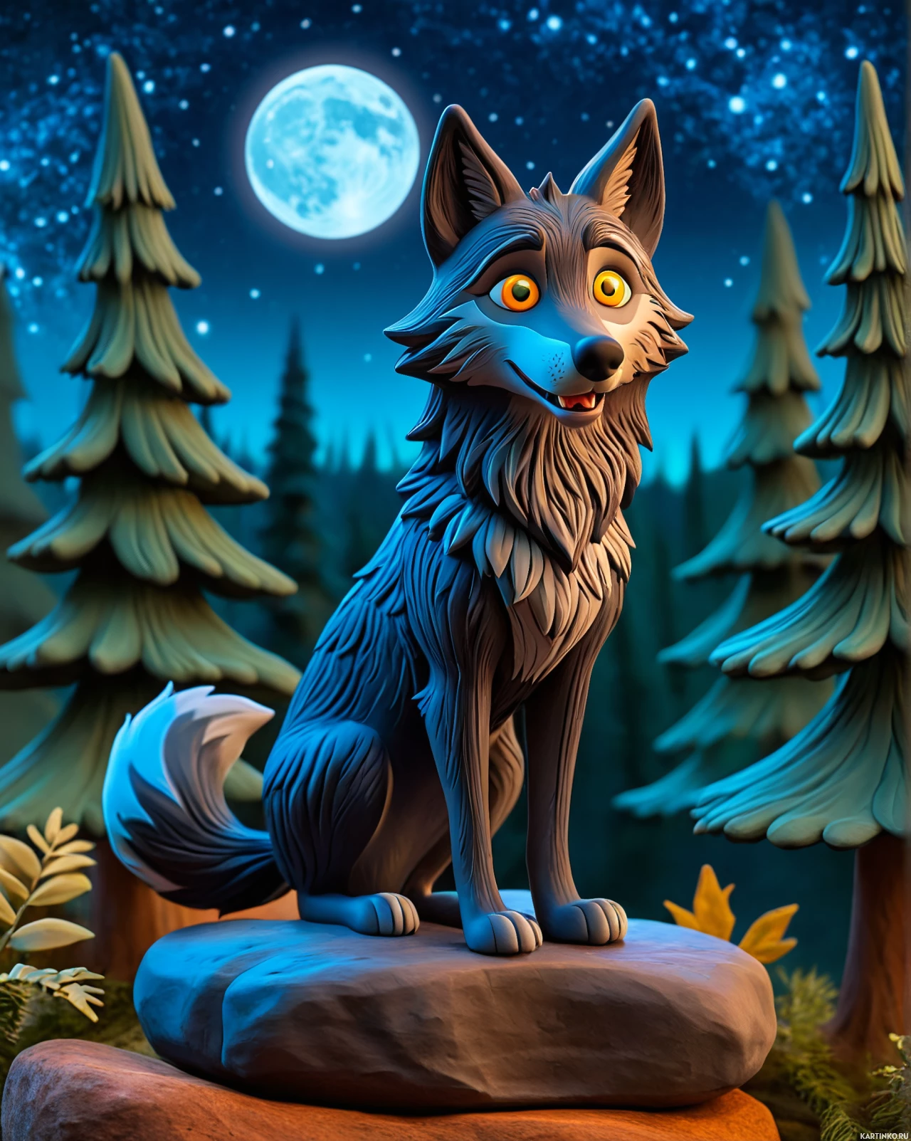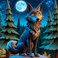 forest setting. The wolf is anthropomorphized with large,
