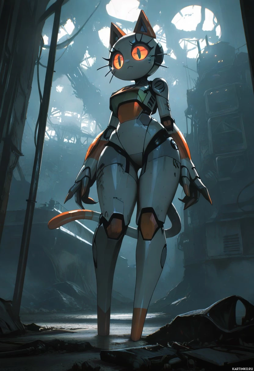 a sleek body and stands upright, is shown from the front with its hands on its hips. It has a glowing yellow-eyed face, typical of a robot or