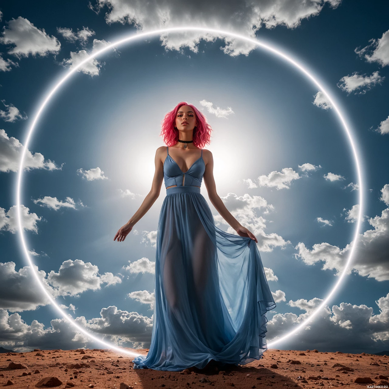 pink hair and is wearing a long blue dress with thin straps over a crop top. Her arms are gently raised near her head, and she gazes into the distance, slightly off to the side. Above her head floats a large, perfect circle that could be interpreted as an eclipse or perhaps a stylized sun. The sky is partly cloudy, adding depth to the image.