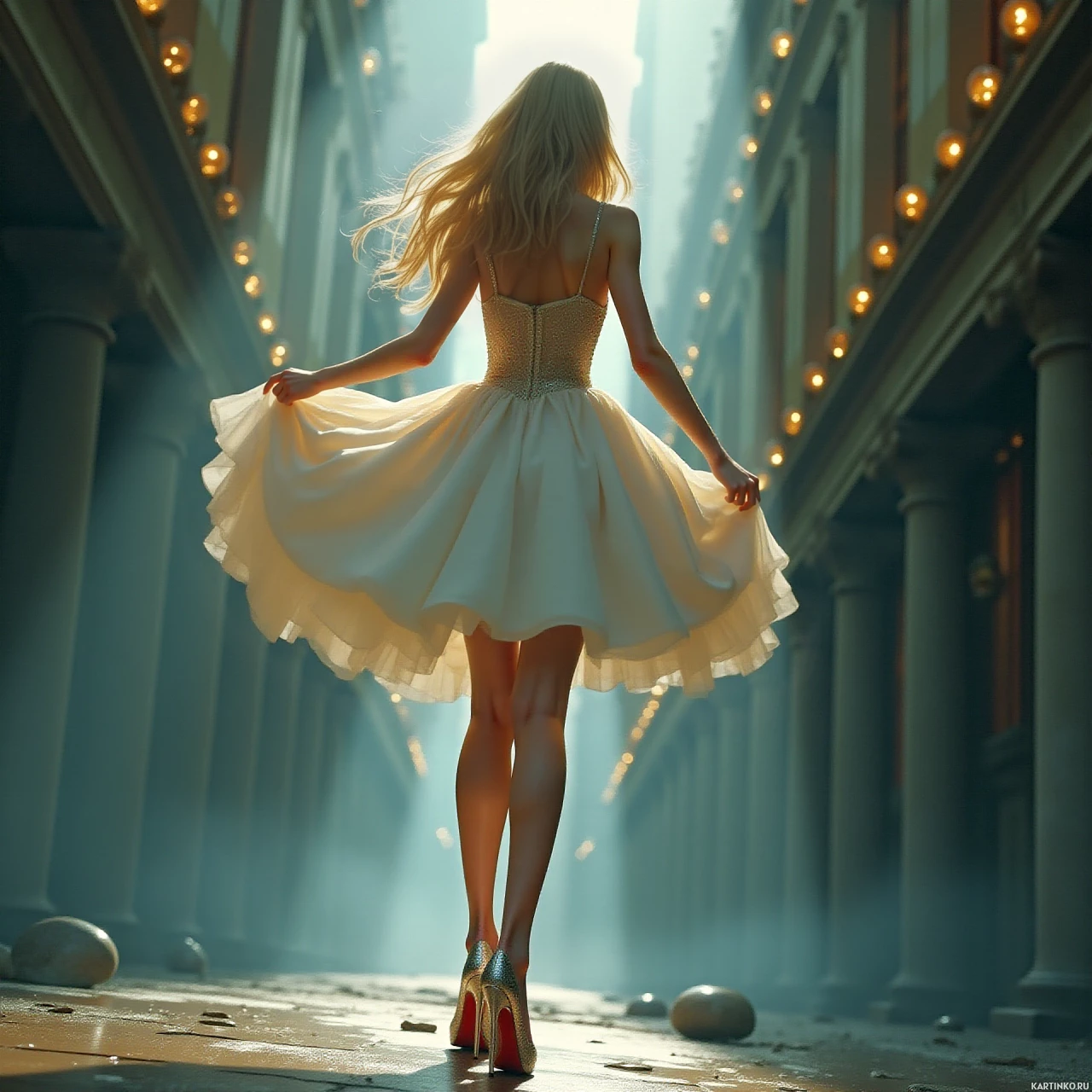 blonde hair and is wearing high heels with visible straps around her ankles. Her dress appears to be strapless, possibly made of a sheer or light-colored fabric, given the way it shimmers under