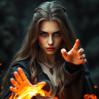 a young woman with long hair, dressed in a dark outfit that resembles wizard or fantasy-themed attire. She is casting an incantation, as indicated by her hands forming the universal sign for magic with fingers extended and palms facing upwards. Around her hands are flames, which suggests she has control over fire. Her expression is focused and intense, fitting the mystical or fantasy context of the image.