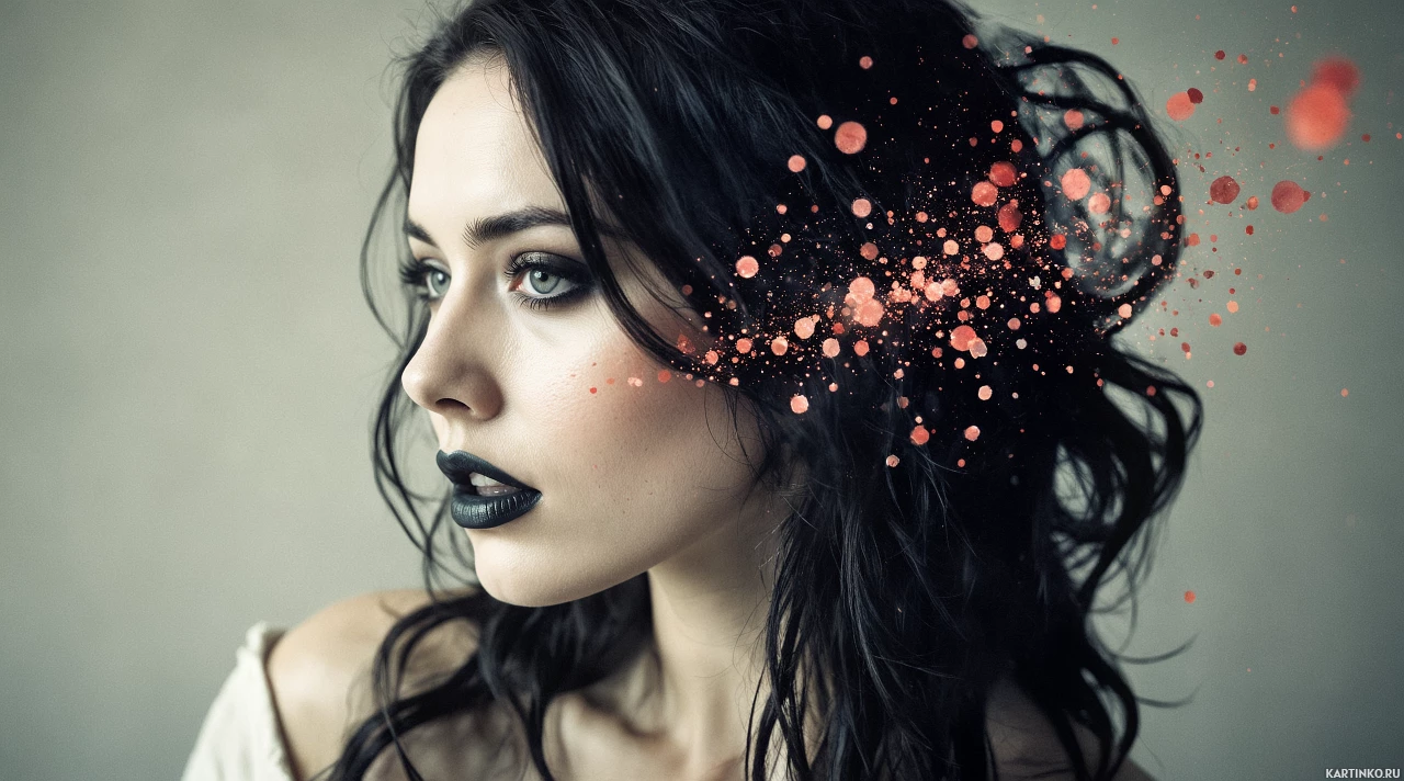 dark lipstick and what appears to be black eyeliner. Around her head are splattered red and