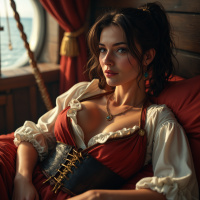 an indoor environment within a maritime theme, possibly a ship or a nautical-themed room, given the wooden beams and the presence of a window that seems to offer a view of water outside. She is gazing directly at the camera with