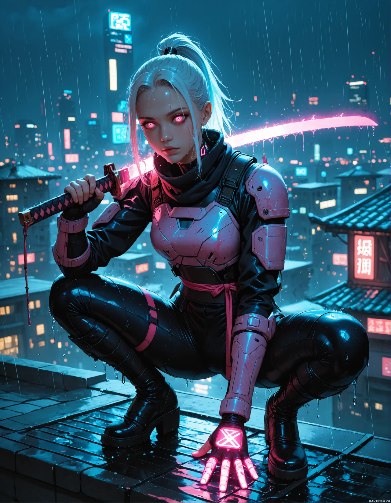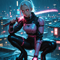 a crouched pose on what seems to be a rooftop, holding a sword with both hands as if ready for combat. The character has