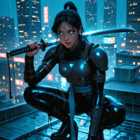 a female character crouched on what appears to be a city rooftop. She is holding a sword in her right hand, which suggests she might be prepared for combat or defense. Her attire consists of a black body suit with armor-like details, indicating that she may be a warrior or an agent trained in