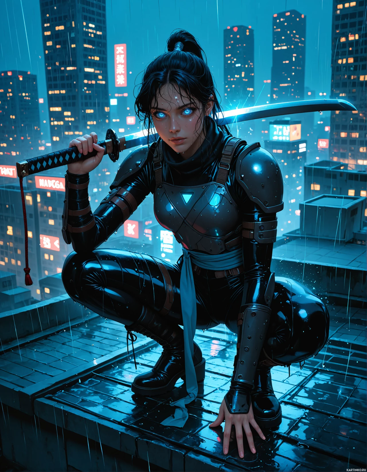 the wet surfaces and the way her clothing and hair are slick with moisture. Her expression is focused, and she seems ready for action. The character has a distinct style that combines elements of anime or manga art with realistic