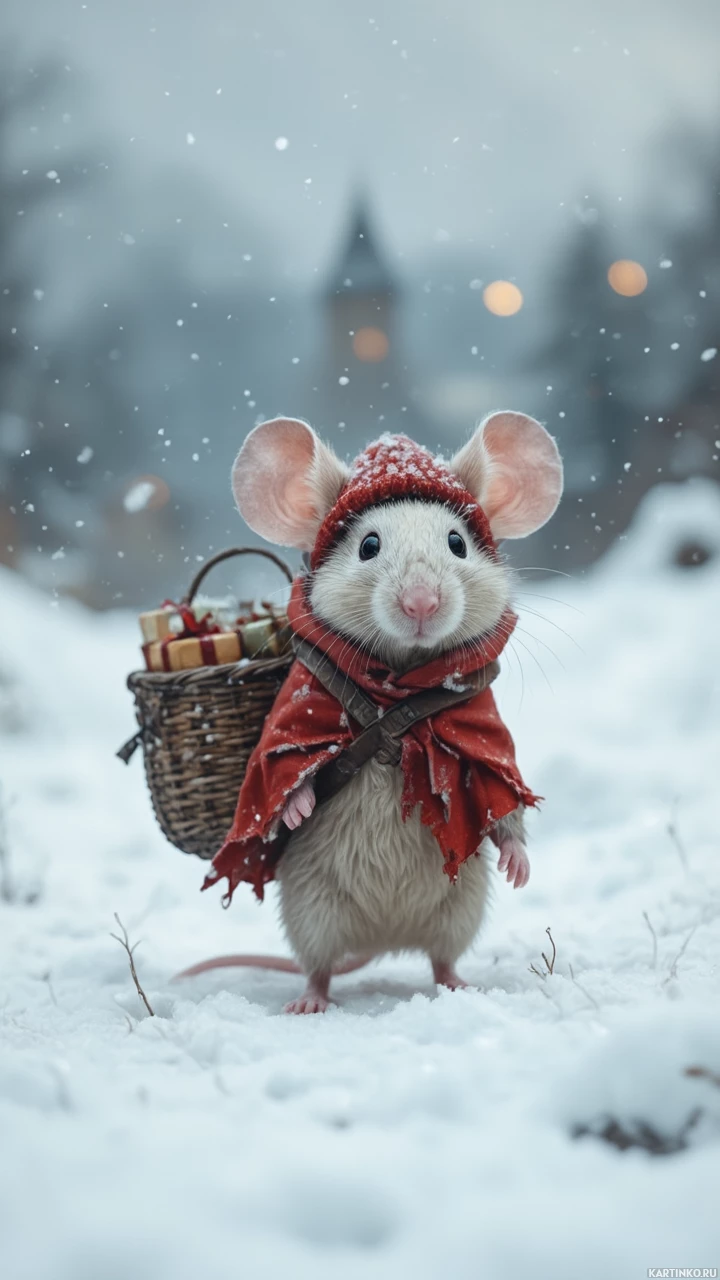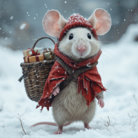 a red coat with a white hood, which gives it an adorable appearance, suggesting the scene might represent a winter or holiday theme. In its mouth, the mouse holds a small basket filled with what seems to be tiny presents or gifts, adding to