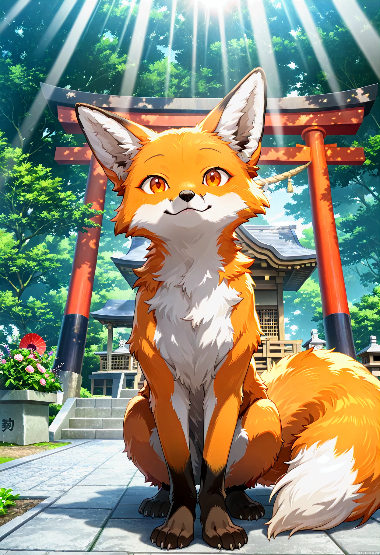 animated fox sitting on what appears to be a stone path leading towards an oriental-style structure, possibly a shrine or temple. The fox has vibrant