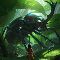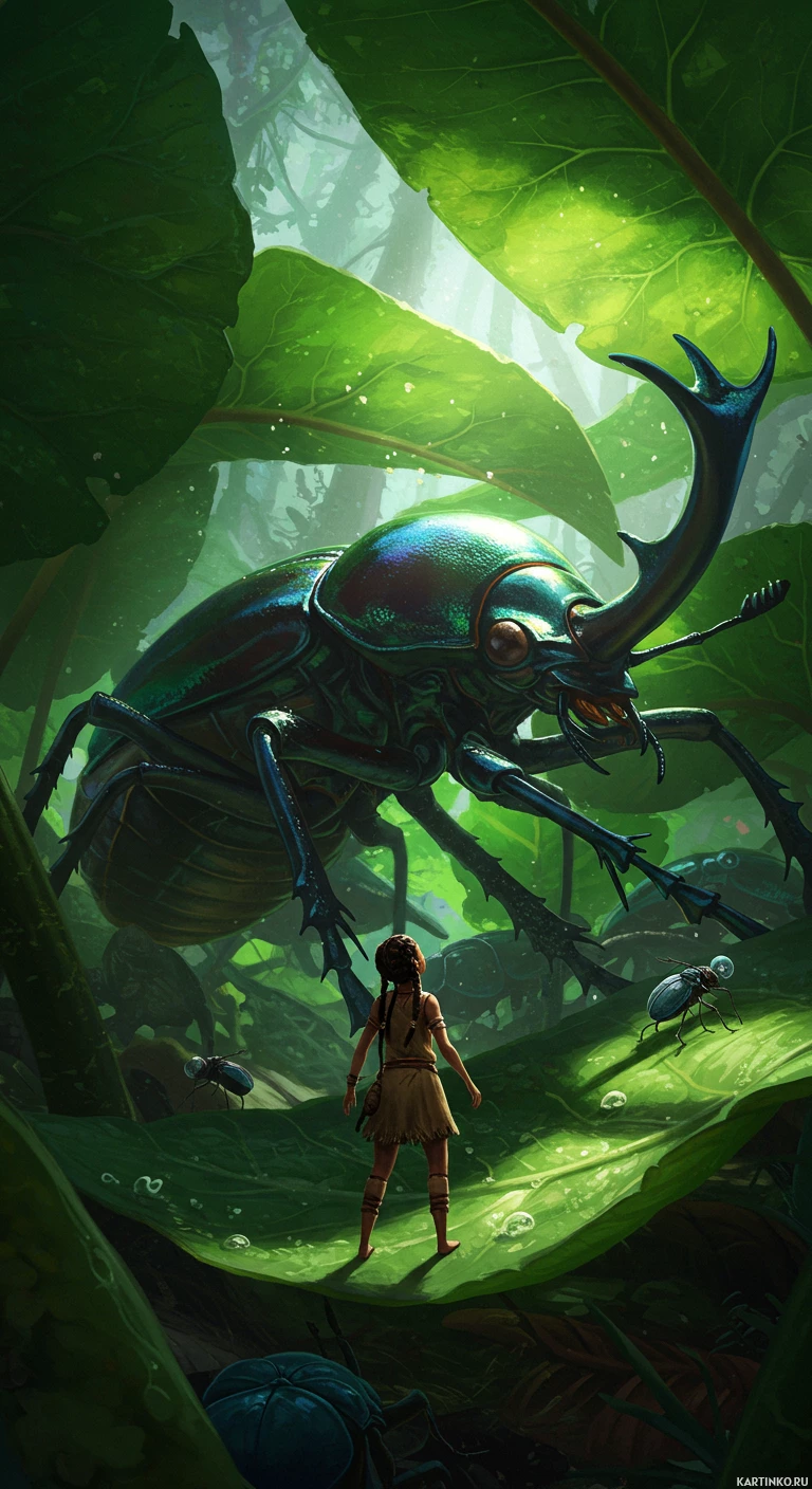 the central part of the frame, is a large insect that resembles a stag beetle due to its size and elongated antennae. The bug's body has