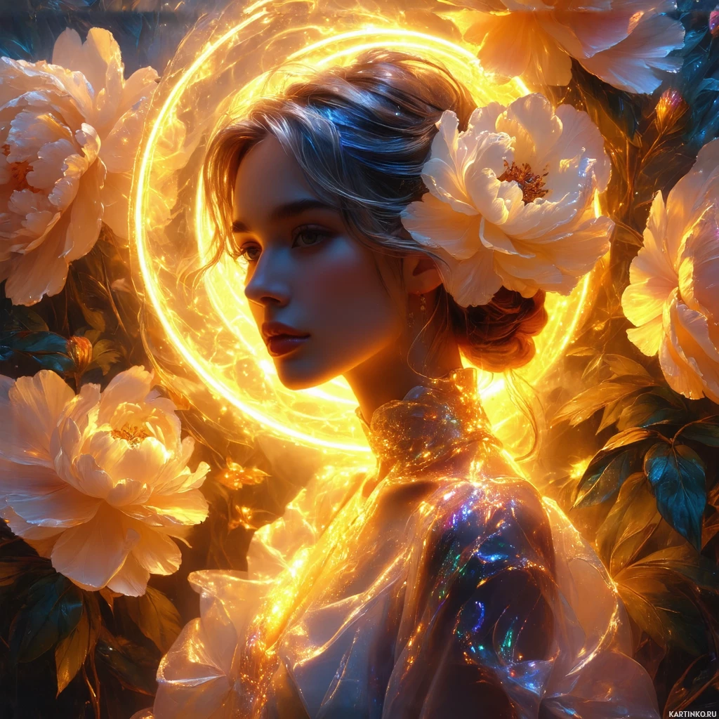 flowing hair that seems to be illuminated by a golden light from above her head. The light creates