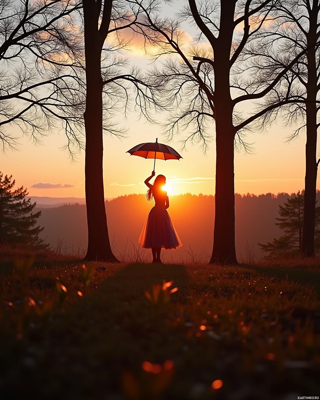 a girl in a dress, standing with her back to the viewer. She is holding an umbrella and appears to be looking away from the viewer towards the sunset. The scene takes place during twilight, as indicated by