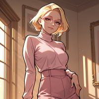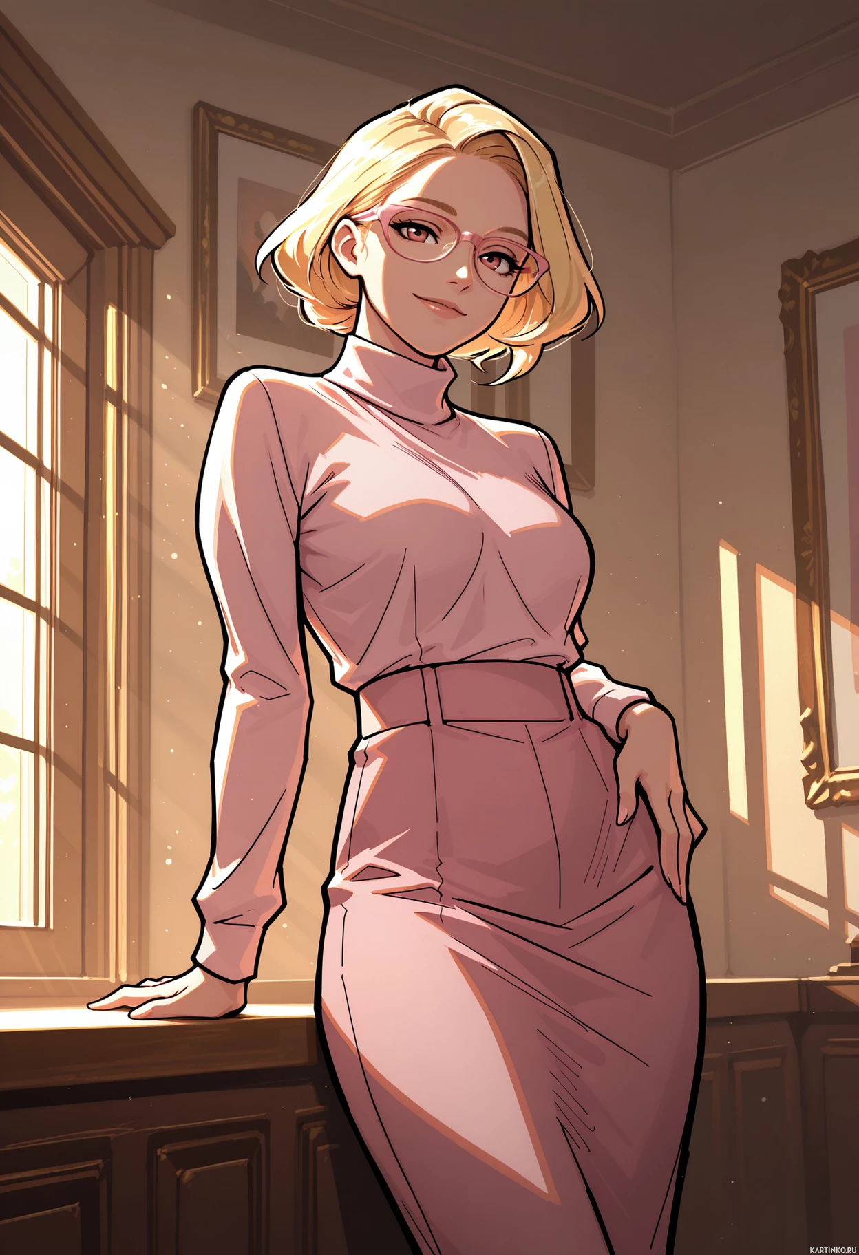 a young woman with blonde hair wearing glasses. She has a short hairstyle and is dressed in