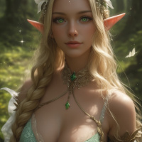 blonde hair and blue eyes. She has pointed ears, which is characteristic of an elf in