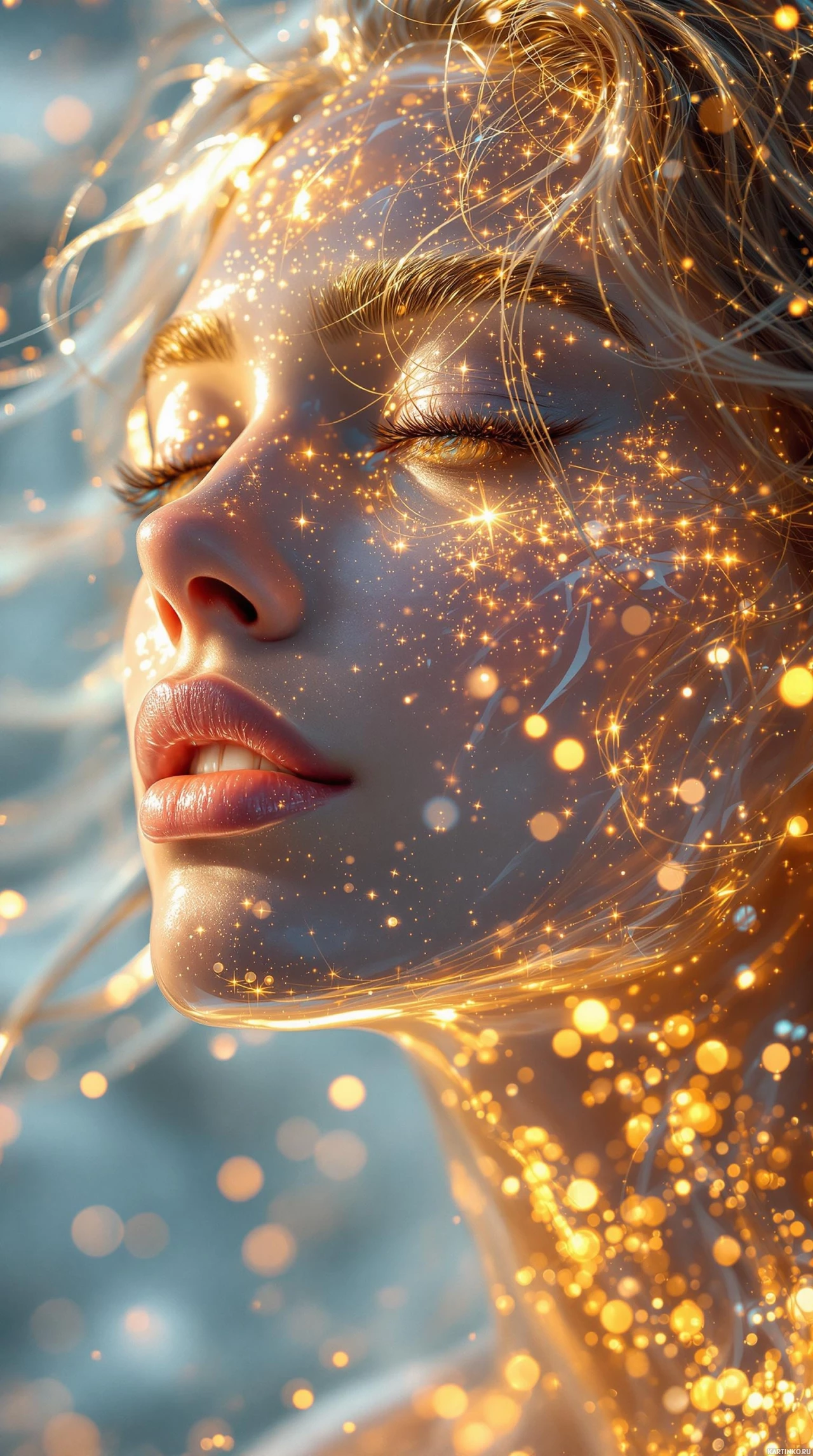 a soft expression. The background is not clearly visible due to the focus on her face and the sparkling particles around it.